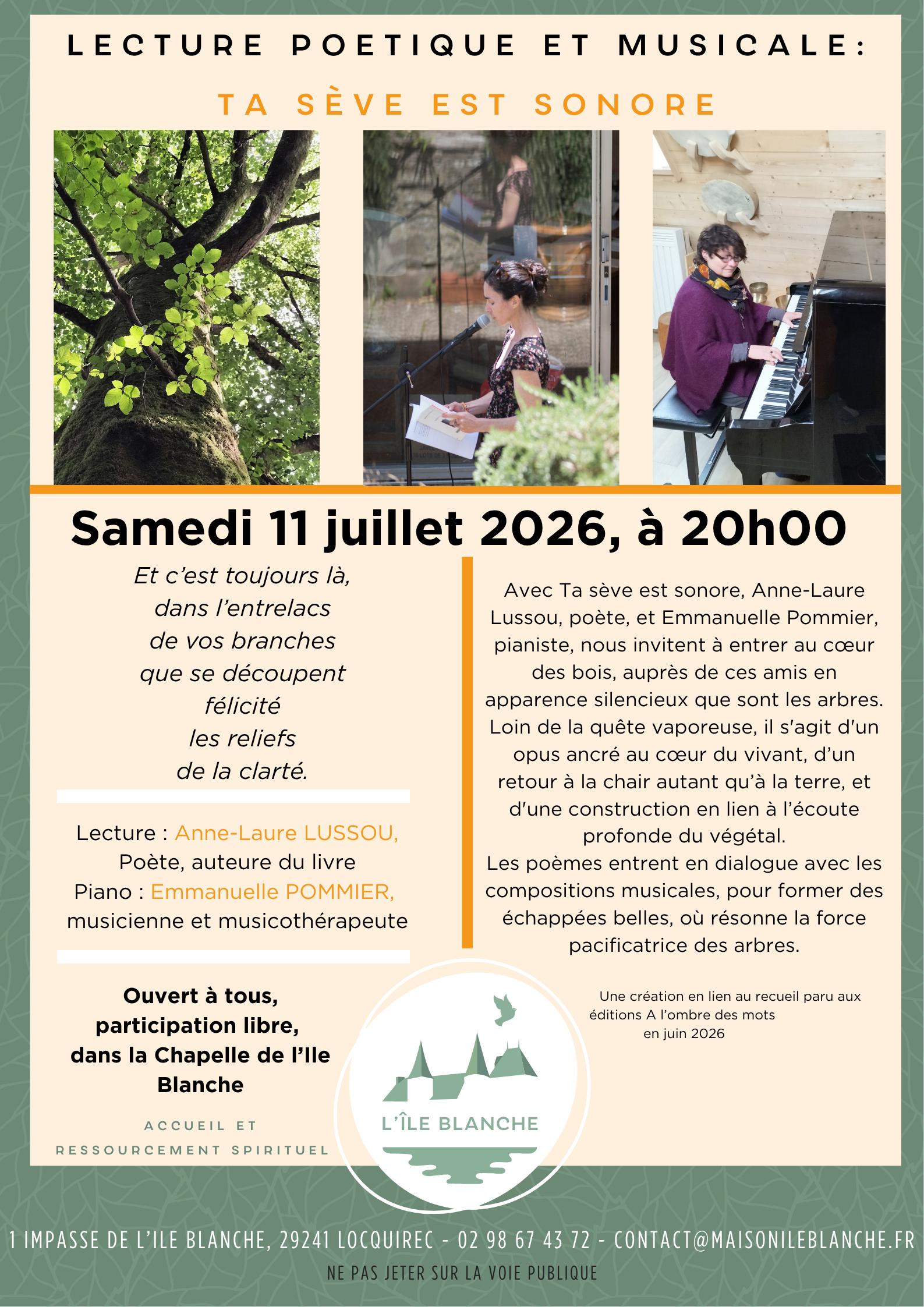 Chapelle de l'Ile BlancheAvec Ta sève est sonore, Anne-Laure Lussou, poète, et Emmanuelle Pommier, pianiste, nous invitent à entrer au cœur des bois, auprès de ces amis en apparence silencieux que sont les arbres. Loin de la quête vaporeuse, il s'agit d'un opus ancré au cœur du vivant, d’un retour à la chair autant qu’à la terre, et […]